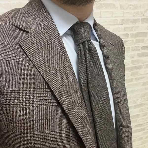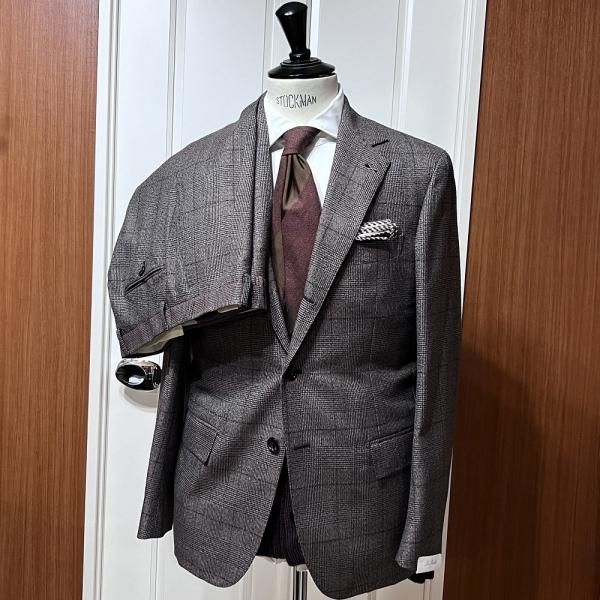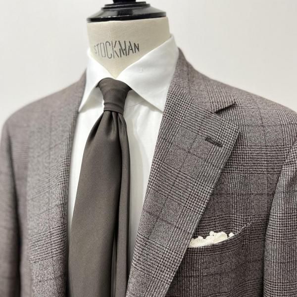 生地にはややグレーのような赤みがかったブラウンにグレンチェックを載せ、クラシックながらも都会的でモダンな印象に。