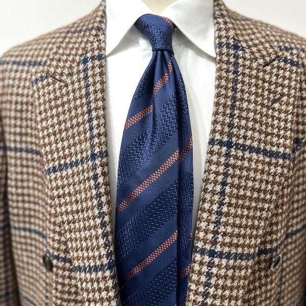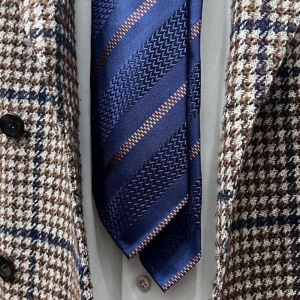 ブルーのヘリンボーン柄にオレンジのマルチストライプのコンビネーションが見事でございます。