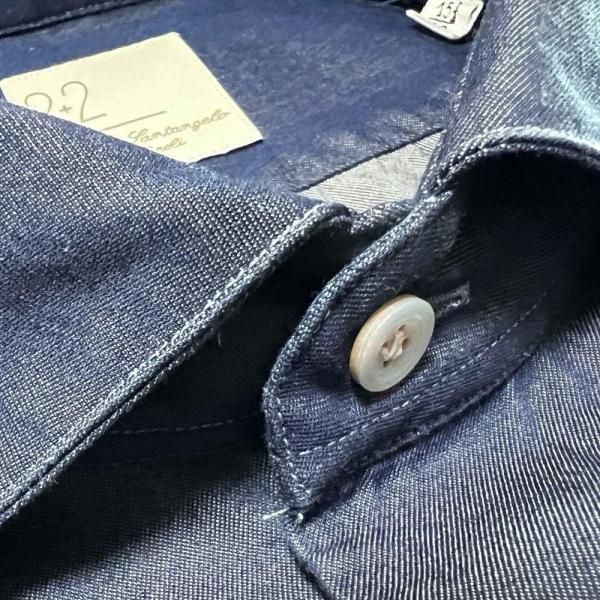 前ボタンを干場義雅氏が考えた第3ボタン迄開けても良いように間隔が短いENZO仕様でさせて頂いたのは開襟シャツとして、または1枚でも着て頂けたらとの思いがございます。