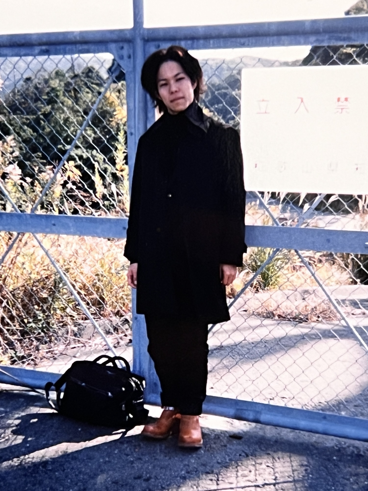 真っ黒な装いでレディースのパンツを穿き、